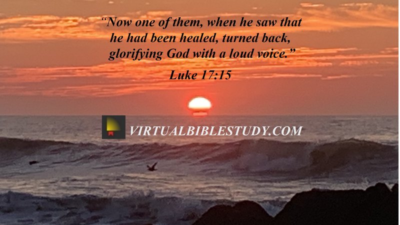 11 While He was on the way to Jerusalem, He was passing between Samaria and Galilee. 12 As He entered a village, ten leprous men who stood at a distance met Him; 13 and they raised their voices, saying, “Jesus, Master, have mercy on us!” 14 When He saw them, He said to them, “Go and show yourselves to the priests.” And as they were going, they were cleansed. 15 Now one of them, when he saw that he had been healed, turned back, glorifying God with a loud voice, 16 and he fell on his face at His feet, giving thanks to Him. And he was a Samaritan.17 Then Jesus answered and said, “Were there not ten cleansed? But the nine—where are they? 18 Was no one found who returned to give glory to God, except this foreigner?” 19 And He said to him, “Stand up and go; your faith has made you well.”