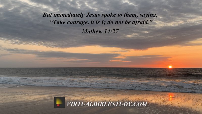 22 Immediately He made the disciples get into the boat and go ahead of Him to the other side, while He sent the crowds away. 23 After He had sent the crowds away, He went up on the mountain by Himself to pray; and when it was evening, He was there alone. 24 But the boat was already a long distance from the land, battered by the waves; for the wind was contrary. 25 And in the fourth watch of the night He came to them, walking on the sea. 26 When the disciples saw Him walking on the sea, they were terrified, and said, “It is a ghost!” And they cried out in fear. 27 But immediately Jesus spoke to them, saying, “Take courage, it is I; do not be afraid.”