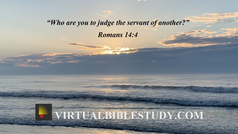 13 Therefore let us not judge one another anymore, but rather determine this—not to put an obstacle or a stumbling block in a brother’s way. 14 I know and am convinced in the Lord Jesus that nothing is unclean in itself; but to him who thinks anything to be unclean, to him it is unclean.15 For if because of food your brother is hurt, you are no longer walking according to love. Do not destroy with your food him for whom Christ died. 16 Therefore do not let what is for you a good thing be spoken of as evil; 17 for the kingdom of God is not eating and drinking, but righteousness and peace and joy in the Holy Spirit. 18 For he who in this way serves Christ is acceptable to God and approved by men. 19 So then we pursue the things which make for peace and the building up of one another. 20 Do not tear down the work of God for the sake of food. All things indeed are clean, but they are evil for the man who eats and gives offense. 21 It is good not to eat meat or to drink wine, or to do anything by which your brother stumbles. 22 The faith which you have, have as your own conviction before God. Happy is he who does not condemn himself in what he approves. 23 But he who doubts is condemned if he eats, because his eating is not from faith; and whatever is not from faith is sin.